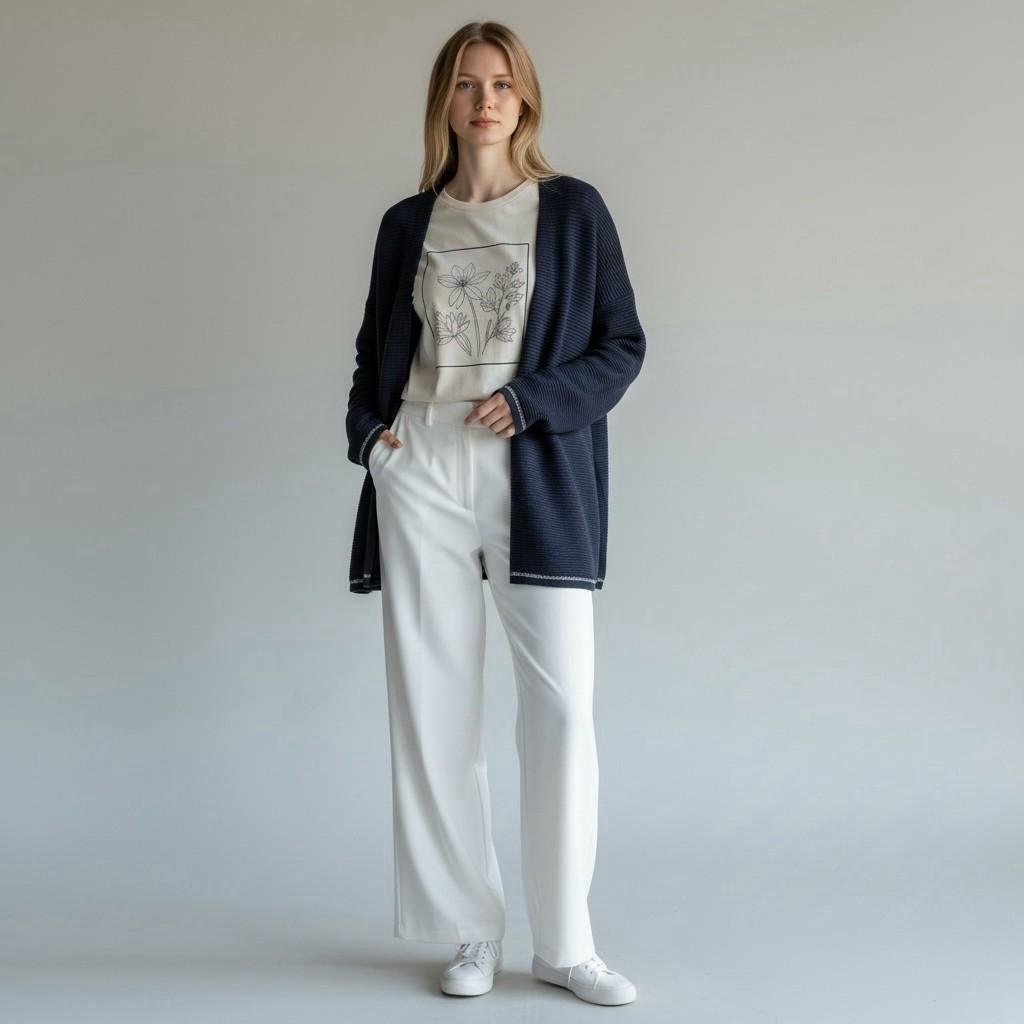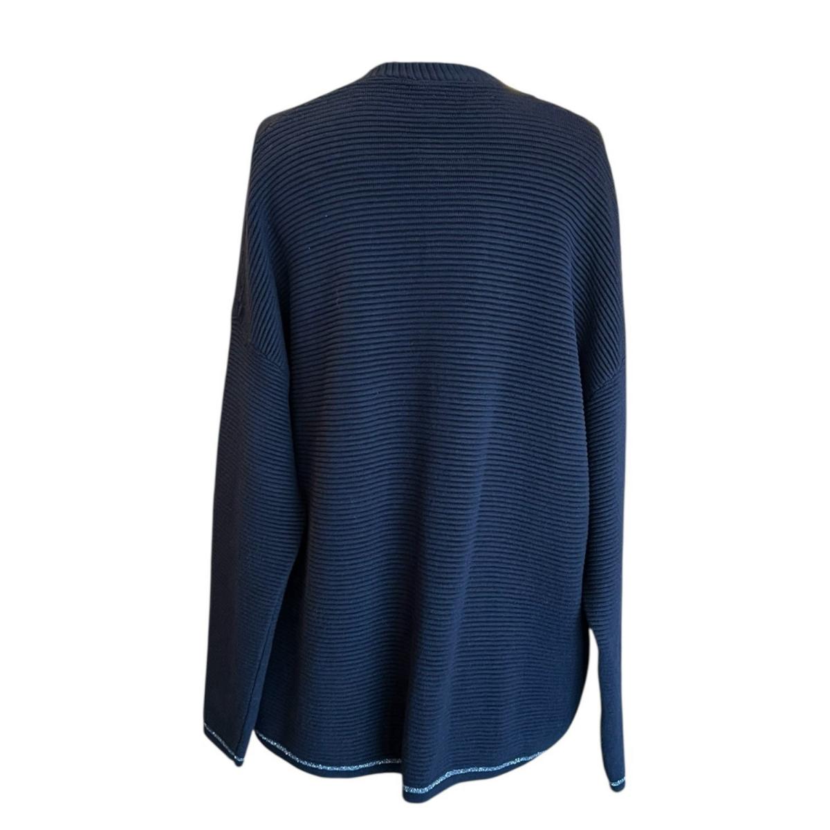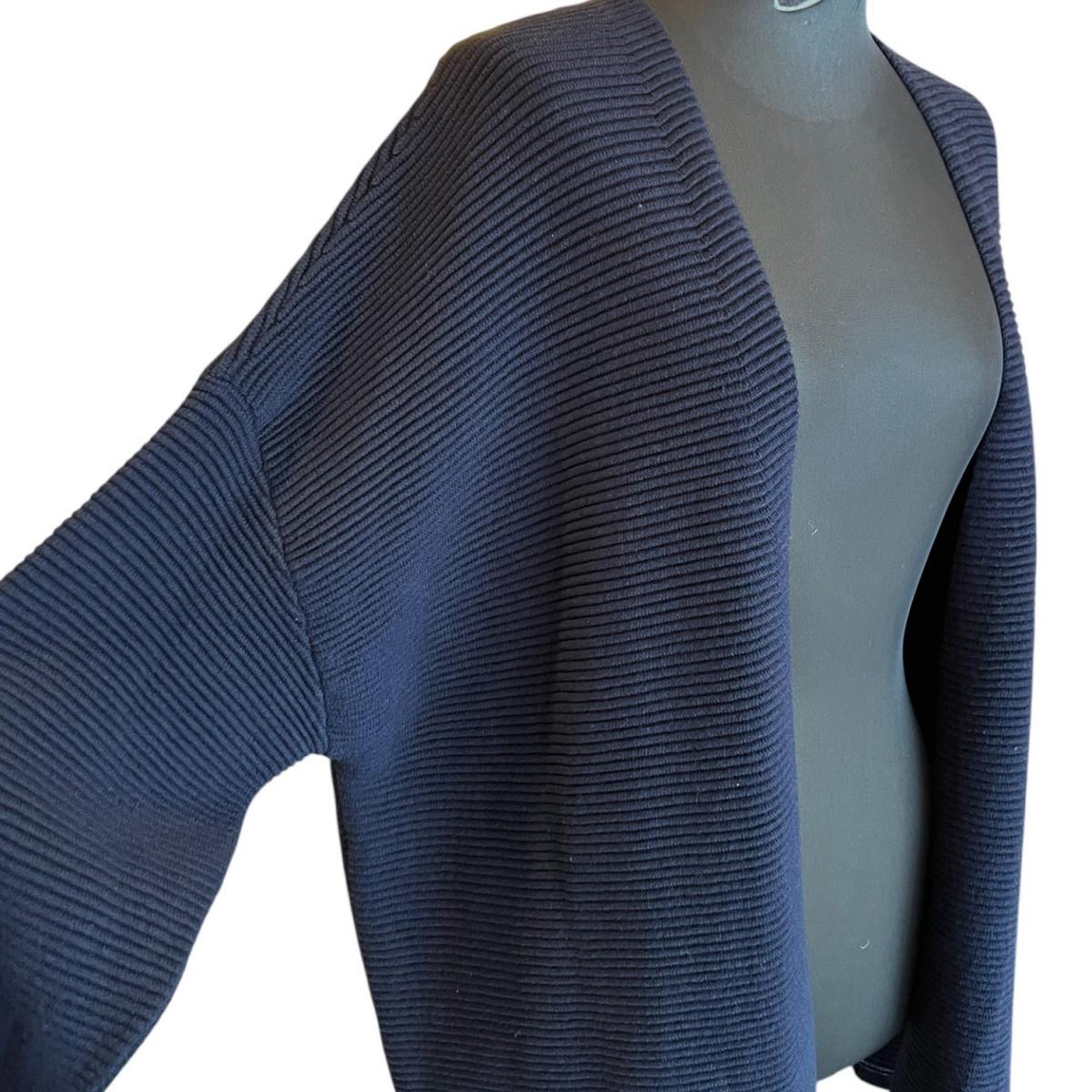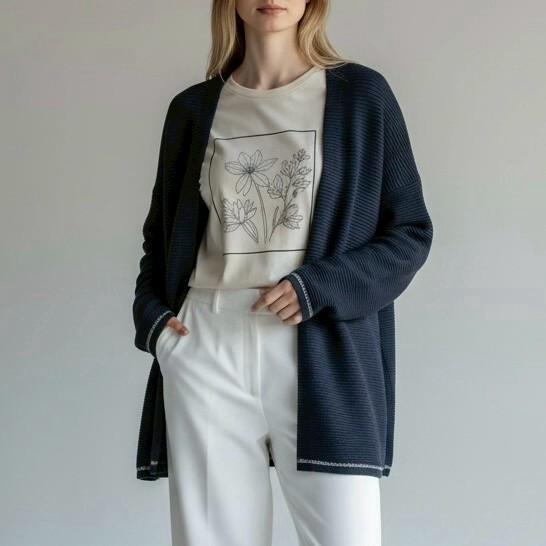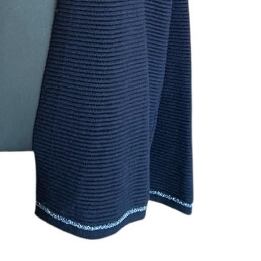 袖口と裾に施された、ステッチのような細いライン状の装飾がポイントです。シンプルなネイビーのカーディガンに、上品でさりげないアクセントを加えています。